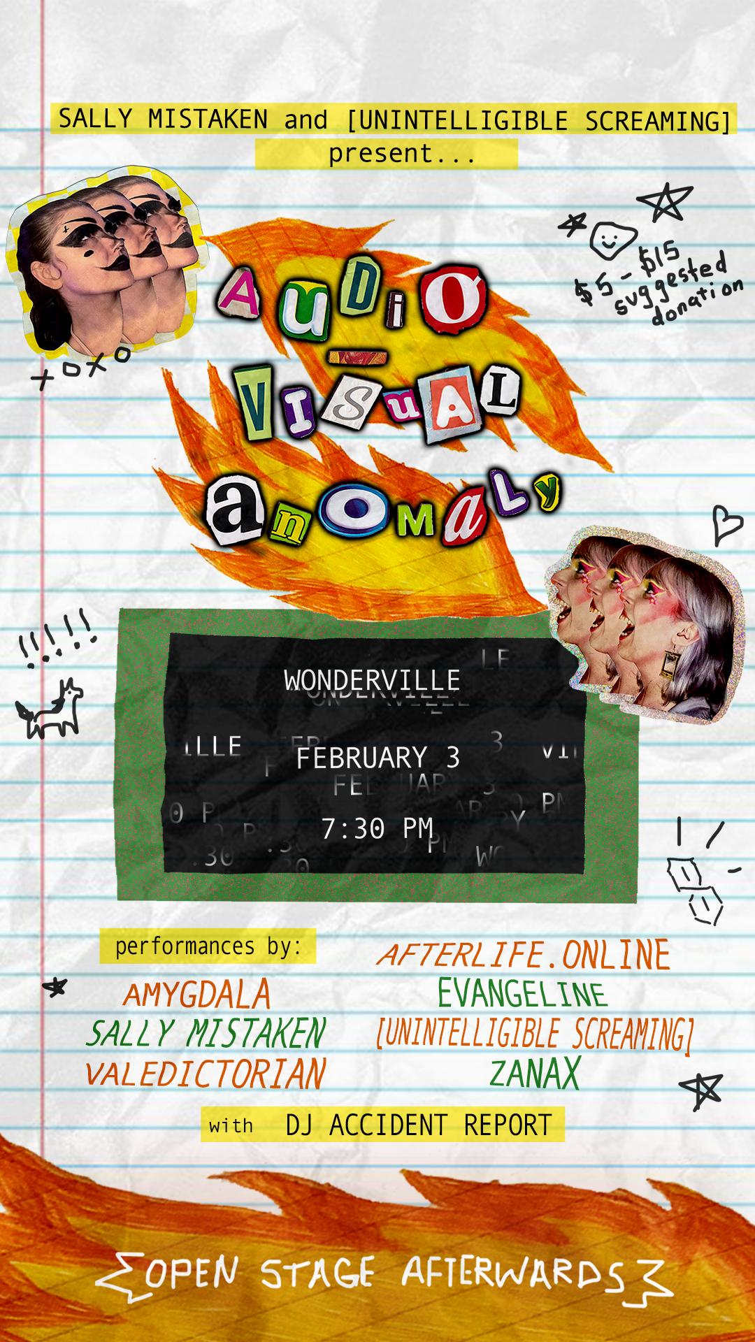Y'ALL DON'T KNOW WHO IT IS!! Sally Mistaken, [unintelligible screaming], and DJ Accident Report present Audio-Visual Anomaly, a night of mixed media mayhem where anything goes and you have to accept that it's art. Featuring a rotating cast of drag creatures and musicians, A-V Anomaly is a space dedicated to multimedia experimentation and unfettered stupidity.