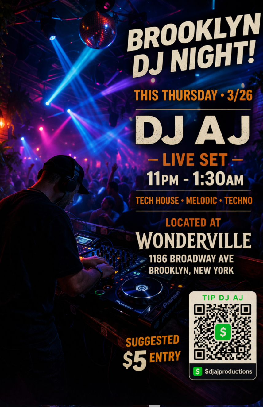 DJAJ Thursday, March 26, 2026 11:00 PM 23:00 Friday, March 27, 2026 1:30 AM 01:30 Wonderville 1186 Broadway Brooklyn, NY, 11221 United States (map) Google Calendar ICS DJAJ— @helloitsdjaj—insta@therealdjaj—tiktok RSVP