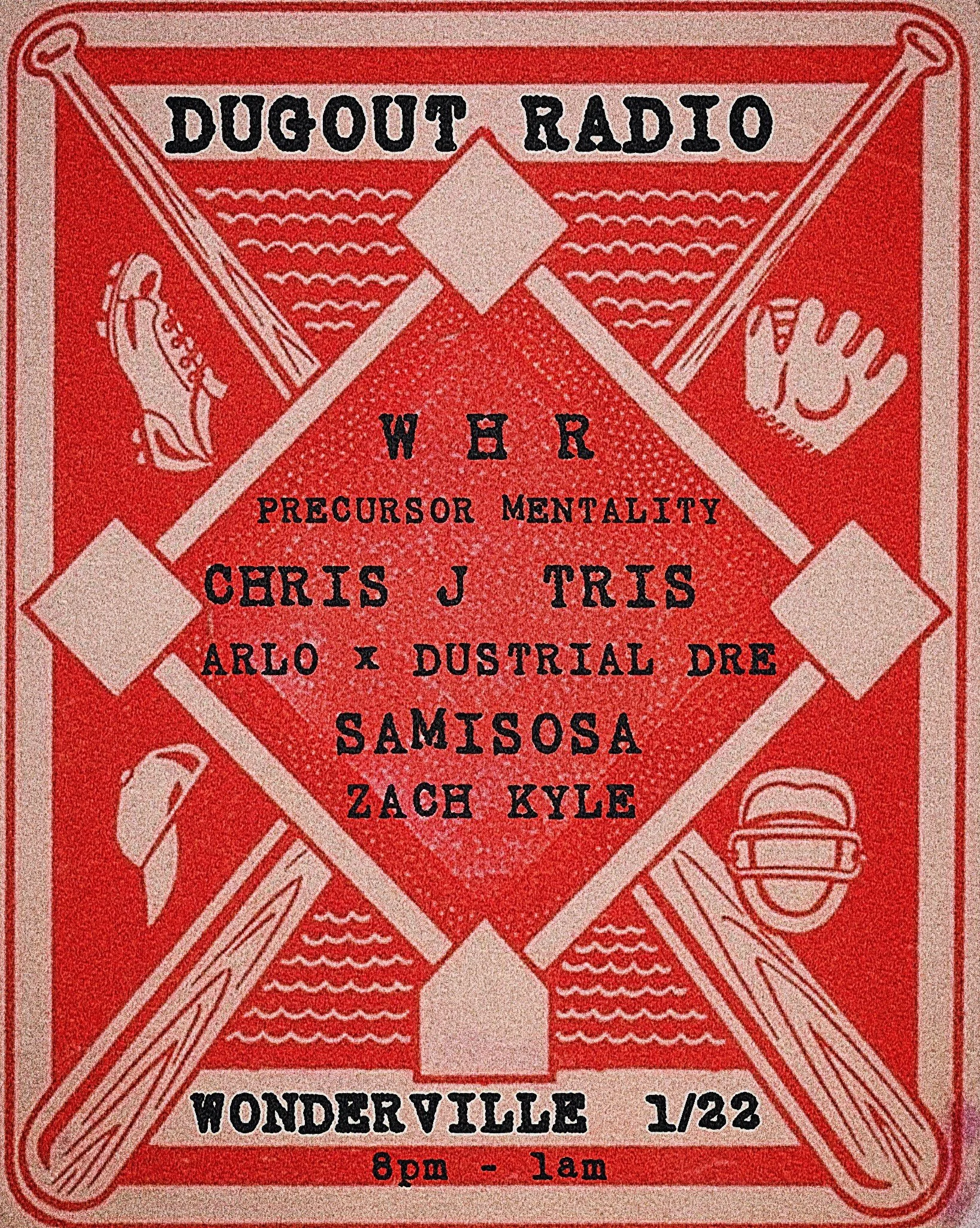 Dugout Radio Monday, January 22, 2024 8:00 PM 20:00 Tuesday, January 23, 2024 1:00 AM 01:00 Wonderville 1186 Broadway Brooklyn, NY, 11221 United States (map) Google Calendar ICS DJ/ARTIST/BEAT SHOW hosted by DUGOUT RADIO Artists: Chris JTris Alro Dustrial Dre WHR Samisoaa Zach Kyle Precursor Mentality RSVP