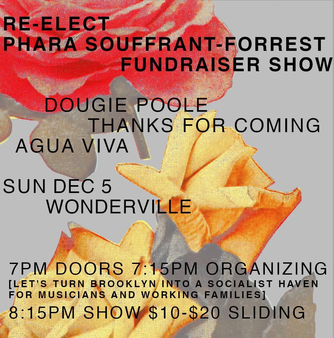 This Sunday December 5 at @wondervillenyc, @NYCDSA's @MusicElectoral Group presents a fundraiser to re-elect New York State Assemblymember Phara Souffrant Forrest! Music by @thanksforcomingband, @agua__viva and @dougiepoole666. Come early for our @musicelectoral open meeting and info session from 7-8pm to learn about MEG and how to get involved in 2022.