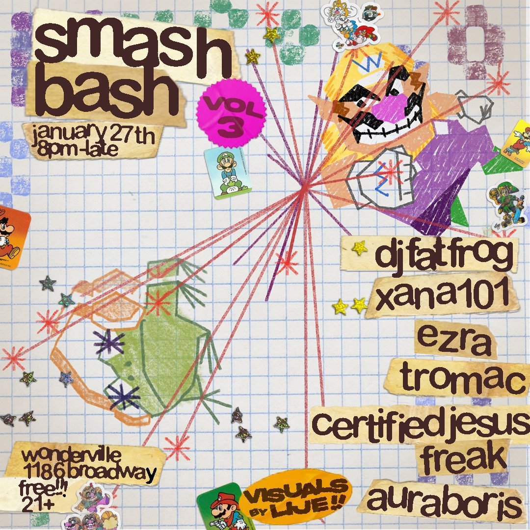 Smash Bash returns to Wonderville! @dj.fat.frog hosts another evening of rousing battles in Smash Ultimate, paired with DJs spinning club, jungle, dance, etc. all night long. As always expect to fight for your honor in a 64 person tournament with epic gorgeous prizes on the line ($1-2 entry)