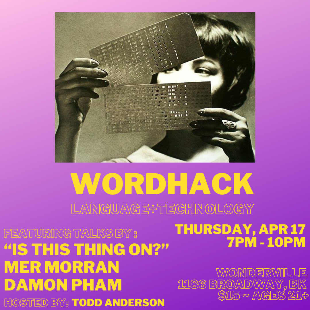 WordHack is a monthly evening of performances and talks exploring the intersection of language and technology. Code poetry, digital literature, e-lit, language games, coders interested in the creative side, writers interested in new forms writing can take, all are welcome here.